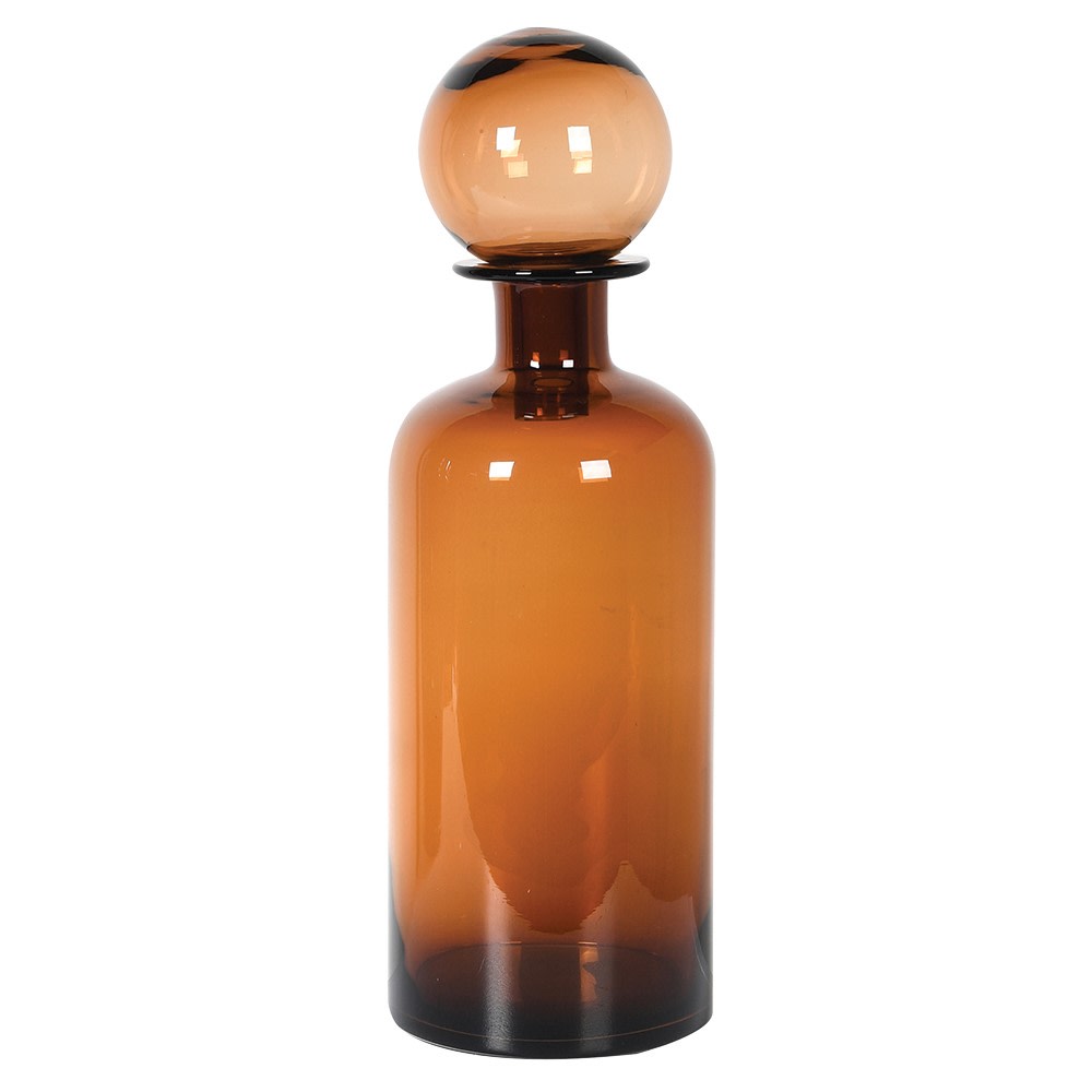 Ideal for a variety of uses, this bottle is not just a vessel; it's a piece of functional art. The amber glass is an excellent choice for storing liquids. The tall and slender design, coupled with the ball top, makes it an eye-catching addition to your decor, whether displayed on a shelf, countertop, or as a unique centrepiece coupled with other bottles as well. Elevate your home with the allure of our Tall Fire Bottle with Ball Top – where vintage aesthetics meet contemporary utility in one captivating piece.