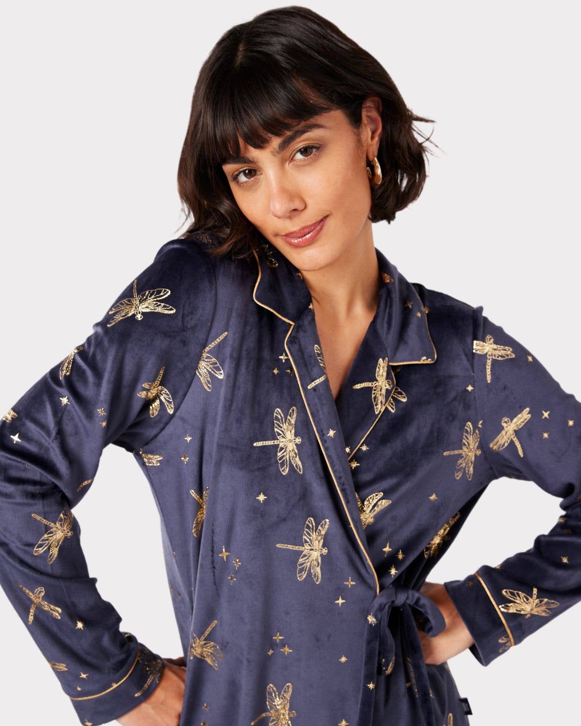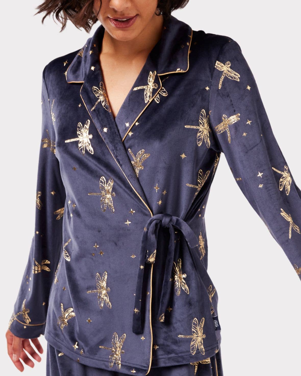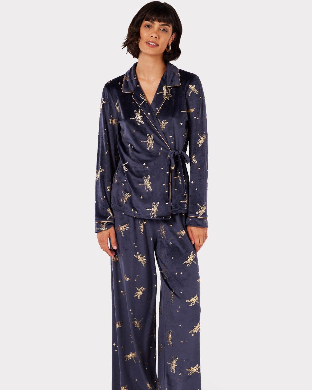 Velour Navy & Gold Foil Dragonfly Print Long Pyjama Set